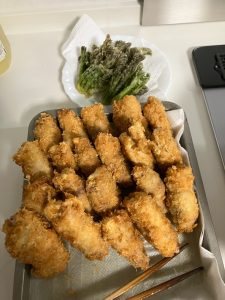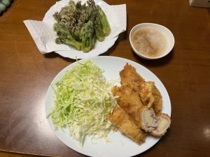 そんなこんなで、たけのこは肉巻きフライ、たらの芽は天ぷらに仕上がりました。