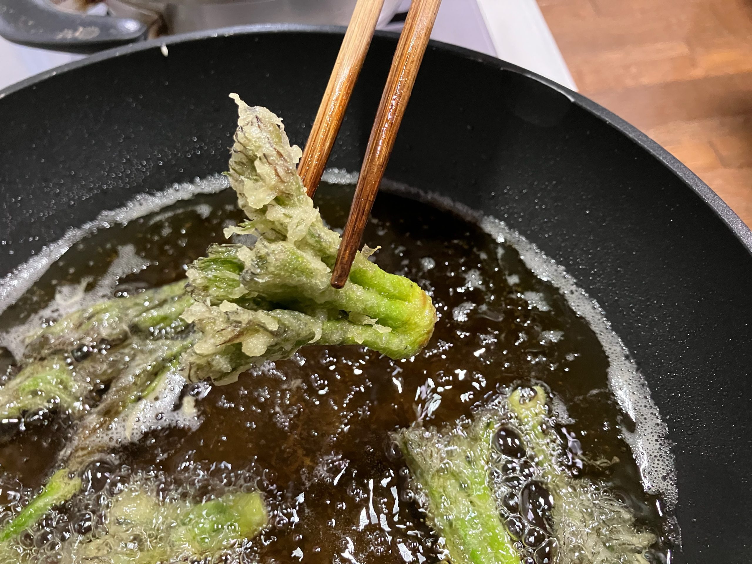 そのあと、下処理をしながら、何の料理にするかを相談し、たらの芽は天ぷら、たけのこは豚肉巻きフライで決定。
